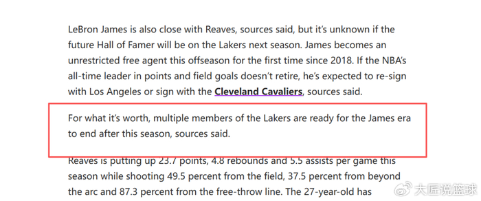 数名消息人士向其透露,湖人内部多名成员已经做好了本赛季后迎接詹姆斯时代终结的准备。